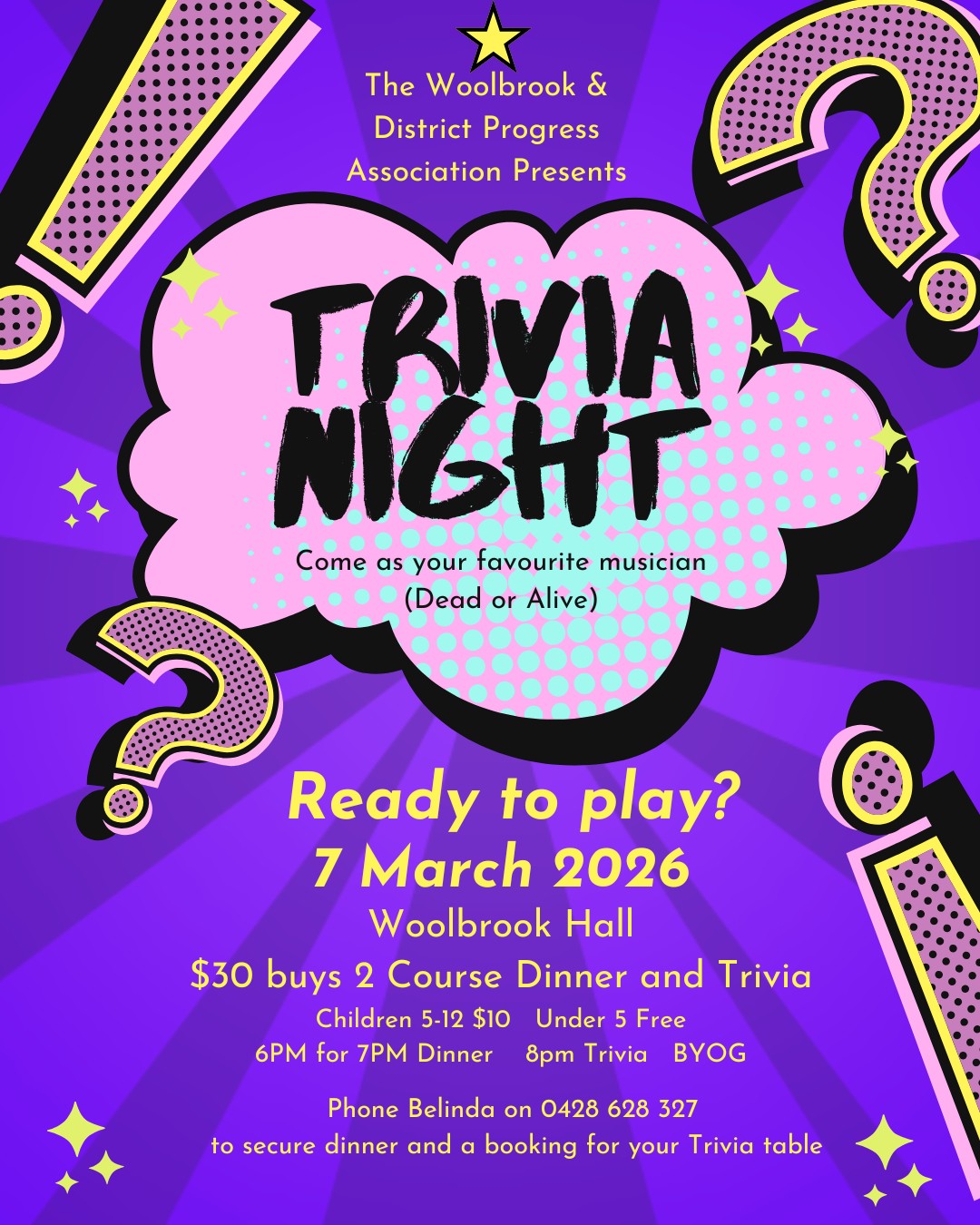 For further information or to book a table, phone Belinda on 0428 628 327.