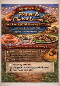 A much-loved local tradition returns! Join the Niangala community for the 36th Prawn & Chicken Evening — a relaxed, laughter-filled night in the heart of the high country.